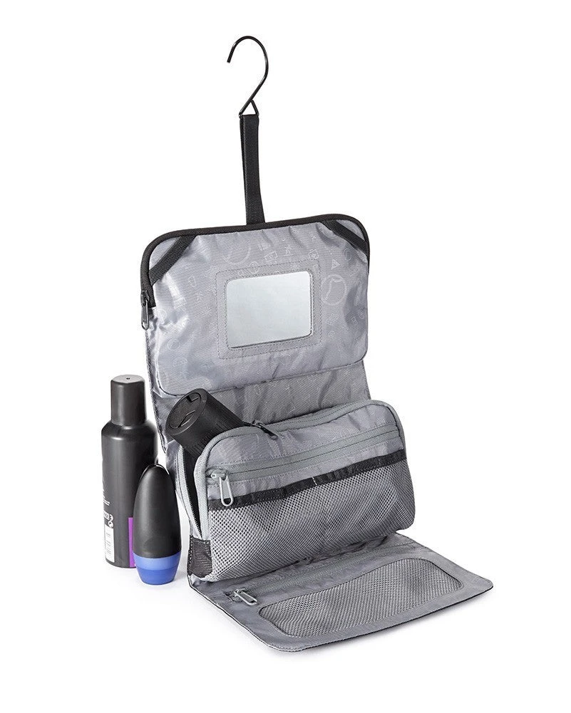 Simple roll-up wash bag with pockets and smash-proof mirror.