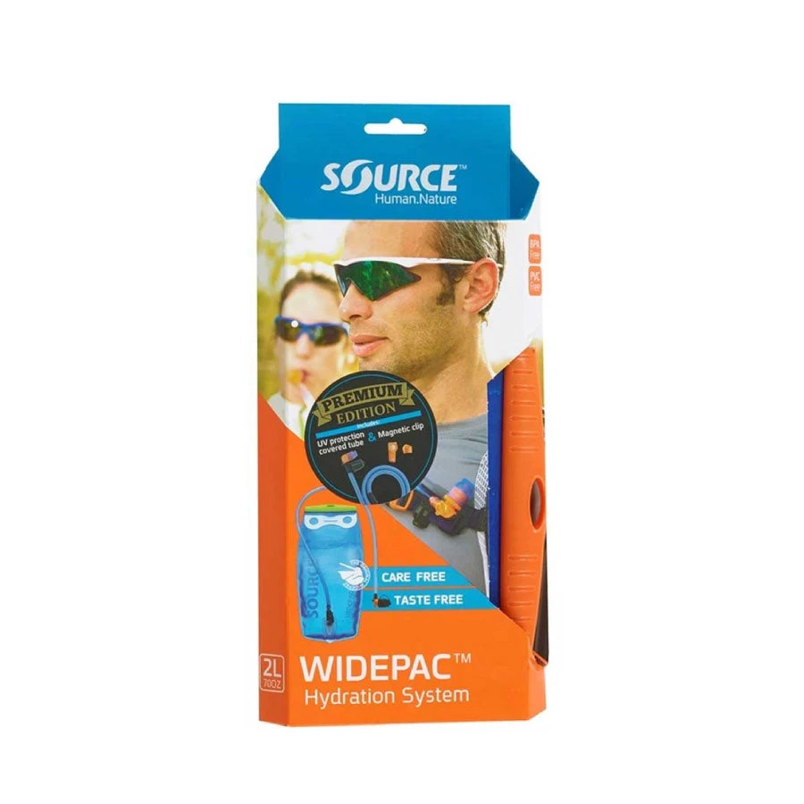 Source Widepac Premium 2 litre water bladder with a magnetic pack clip and tube cover. All the accessories you need to make your water bladder easy to use when on those long hikes.