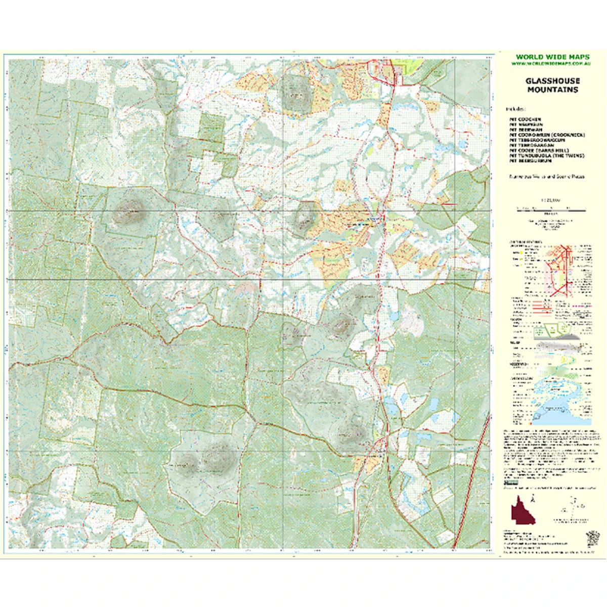 Topo map of the Glasshouse Mountains in South East Queensland at 1:25,000 scale. Includes 9 of the famous mountains:Â
